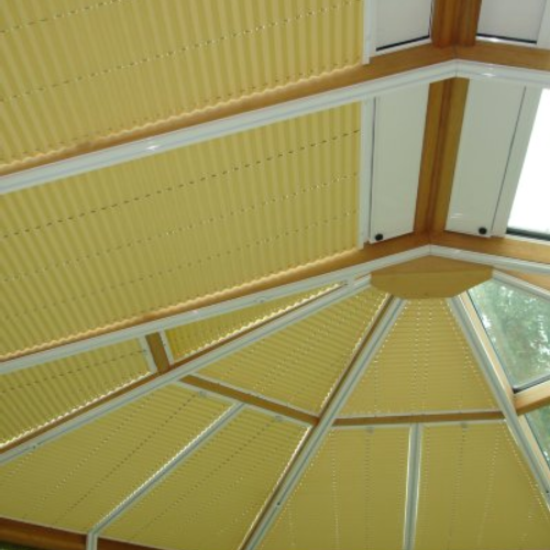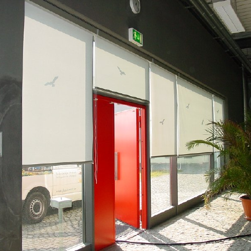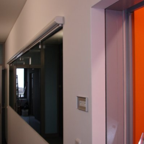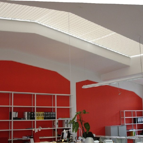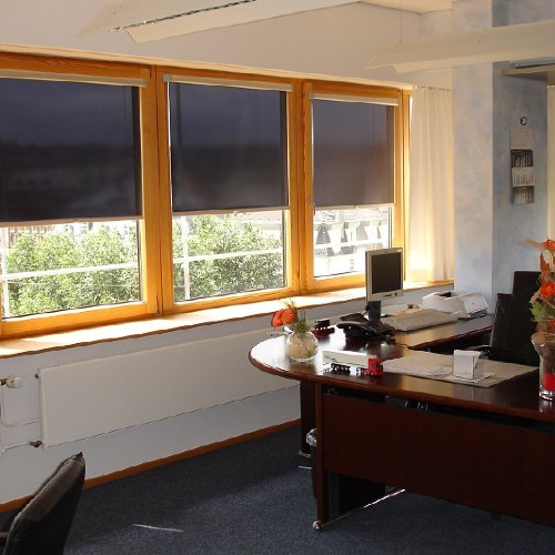 Ausstattung von Objekten mit Sicht - und Sonnenschutz , hier 130 Plisseé-Anlagen | Ausstattung von Objekten mit Rolloanlagen bis 600cm Breite, hier in der WGJ-Stadthalle | Ausstattung von Objekten mit Sicht - und Sonnenschutz , hier Oberlichtbeschattung in einem Architekturbüro | Ausstattung von Objekten mit Sicht - und Sonnenschutz , hier Lamellenanlagen (in Rundung des Hauses gebogen) in einem Büro |