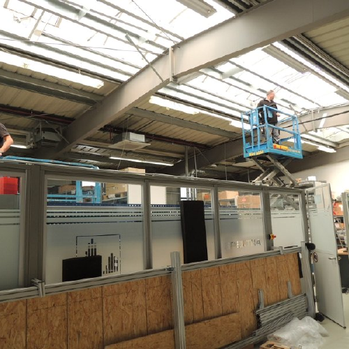 Grenzübergang Breitenau, | Grenzübergang Breitenau, | Oberlichtbeschattung in einer Werkhalle. hier bei der Montage | Oberlichtbeschattung mit aufrollbaren Sonnensegeln, mit Seitenführungsschienen und Kassette |