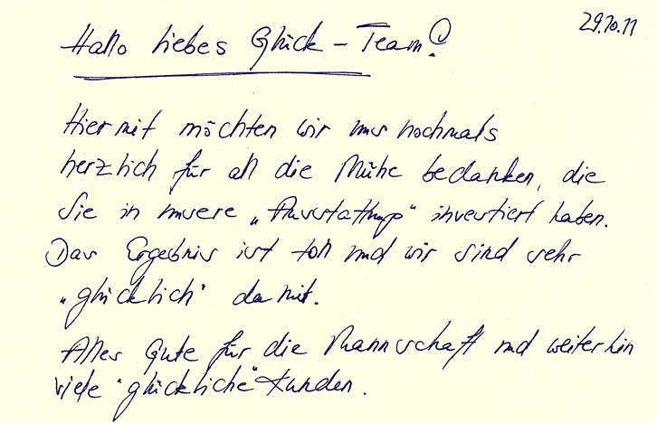"Zum Glück haben wir bei Glück gekauft, in diesem Sinne möchten wir uns noch einmal für den super guten Service, die freundliche kompetente Beratung und Bedienung bedanken."