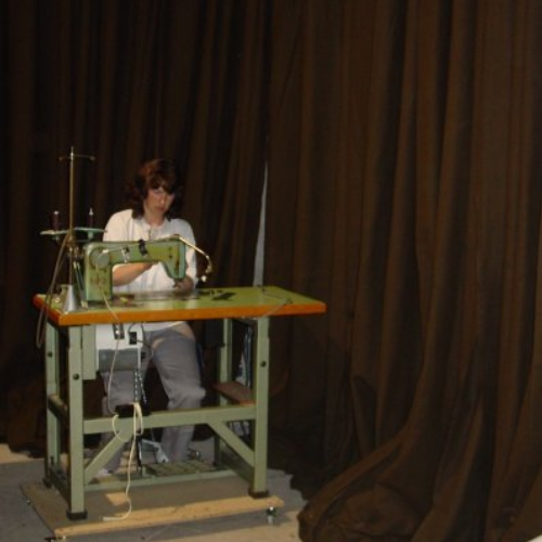Japanische Palais Dresden | komplette Verkleidung der Innenräume mit speziell eingefärbten Dekorationsstoff, ca. 4000.- m² | Montage und Näharbeiten vor Ort, hier Anfertigen der Säume mit einer transportablen Nähmaschine | Das Endergebniss rechtfertigte den Aufwand, |