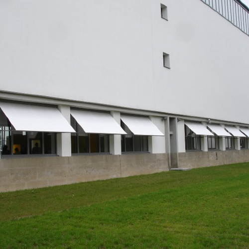 Ausstellung | Ausstellung | Außensonnenschutz, hier Sonnenschutzmarkisen am Kindermuseum des Hygienemuseum Dresden | Anfertigung einer Bespannung mit Dekorationsstoff an einem runden Fenster |