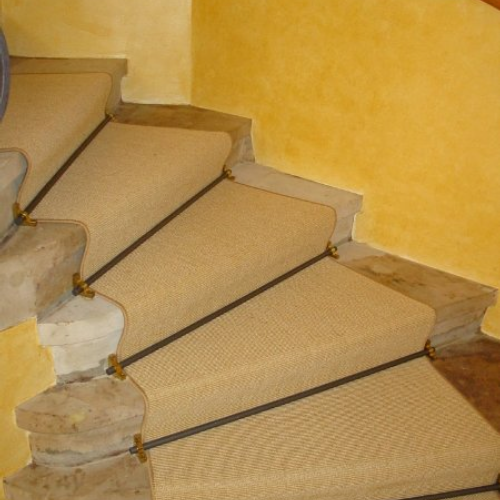 Verlegearbeiten von Treppenbelägen, hier Sisal, individuell der Treppenform angepasst