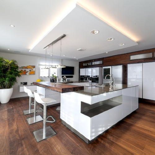 individuelle Verlegung von Parkett Nussbaum in einer Küche auf Boden und an der Rückseite Küchenwand