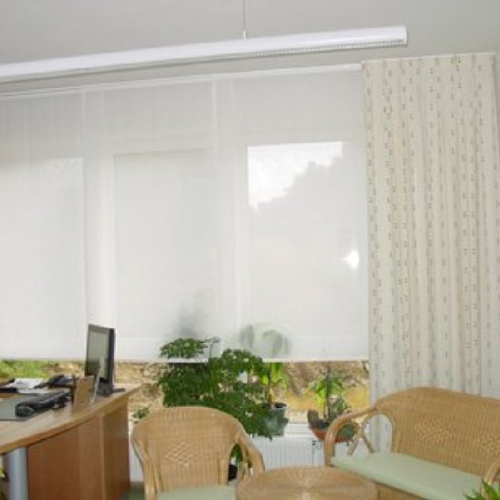 Anfertigung und Montage von Gardinen und Verdunklungs- vorhängen in einem Konferenzraum eines Dresdner Hotels | komplette Ausstattung dieses Hotels im Erzgebirge hier Dekorationen und Sitzkissen im Gastraum | halbtransparente Flächengardinen in einer Arztpraxis | Flächenvorhangsystem mit Holzpaneelen in einem Relaxraum einer Kurklinik. |
